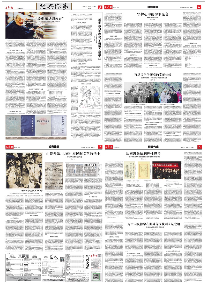 經(jīng)典的魅力在于偉大作家們的創(chuàng)作實踐、人生歷程、理念哲思和學(xué)術(shù)思想,蘊含著豐贍而持久的闡釋可能與意義空間。“指窮于為薪,火傳也,不知其盡也?!睘榻恿Τ欣m(xù)五四以來的新文學(xué)光榮傳統(tǒng),展示當(dāng)代文學(xué)成就與經(jīng)驗,弘揚經(jīng)典作家的當(dāng)代價值,本報決定重啟“經(jīng)典作家??保悦科谒膫€版的容量,以“作家印象”“文學(xué)地理”“重讀經(jīng)典”“文史鉤沉”“學(xué)術(shù)視野”“域外傳真”等專欄,深入體察作家和作品背后的歷史緣由,重新發(fā)現(xiàn)與考辨豐富復(fù)雜的史料細(xì)節(jié),以富于學(xué)理和學(xué)術(shù)性的文字,繼續(xù)向各界讀者揭示中國現(xiàn)當(dāng)代文學(xué)名家熠熠生輝的持久魅力,為當(dāng)代文學(xué)創(chuàng)作提供更多營養(yǎng),向全社會彰顯更多屬于文學(xué)的精神感召和審美力量,為建設(shè)文化強國發(fā)光發(fā)熱。