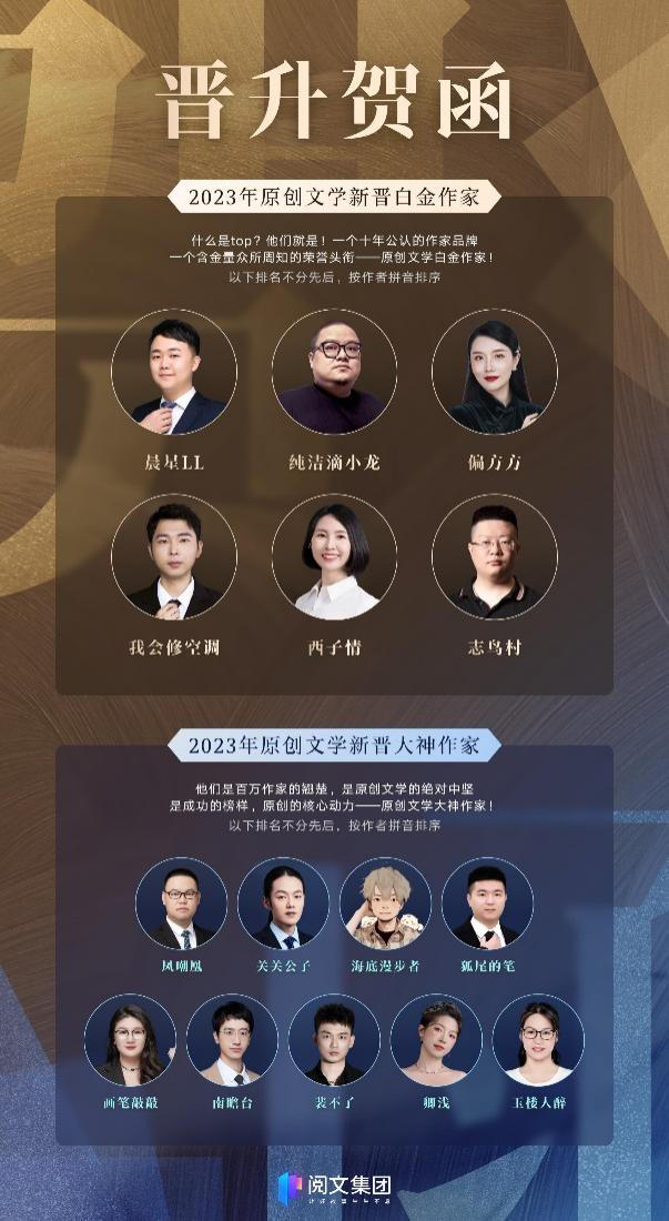 近日,閱文集團發(fā)布2023年新晉“白金大神”名單。其中,晨星LL、純潔滴小龍、偏方方、我會修空調(diào)、西子情、志鳥村等6名作者獲得“白金作家”稱號,鳳嘲凰、關(guān)關(guān)公子、畫筆敲敲、海底漫步者、狐尾的筆、南瞻臺、裴不了、卿淺、玉樓人醉等9名作者摘得“大神作家”榮譽。至此,閱文旗下白金大神作家人數(shù)達458位。