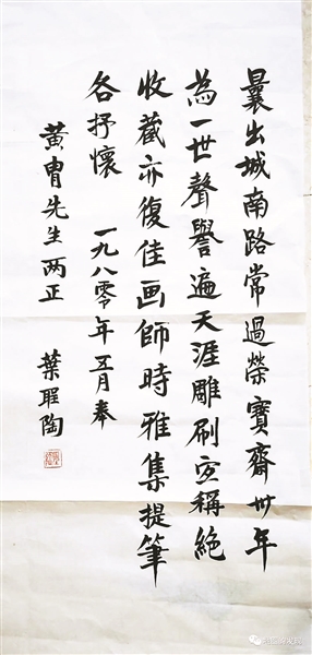 “雕刷宐稱絕”的“宐”通“宜”,《說文》“所安也。從宀之下,一之上”。榮寶齋19世紀末設(shè)立“帖套作”機構(gòu),為后來木版水印事業(yè)的發(fā)展奠定了基礎(chǔ),自然是“雕刷宐稱絕”的了。當(dāng)年的榮寶齋經(jīng)常舉辦書畫家們聚會雅集的活動,所謂“畫師時雅集 提筆各抒懷”,這幅圣老題黃胄大師的條幅,應(yīng)該就是在雅集上相互題贈的抒懷雅物。