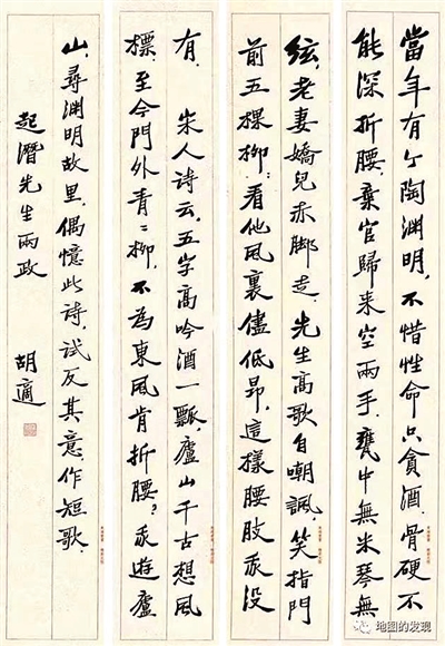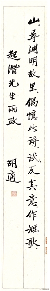 胡適有詩《陶淵明與他的五柳》書法贈顧廷龍(字起潛),最后落款即“起潛先生兩政”?!皟烧保ā罢蓖ā罢?,也作“兩正”),表示請對方對自己寫的詩文、書法兩個方面都給以指正。如果書法是抄寫他人作品,當(dāng)然就不能做“兩政”或“兩正”。
