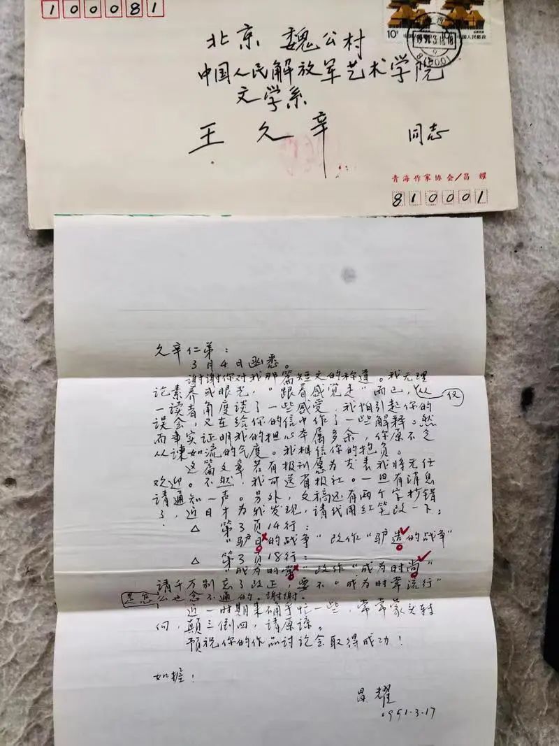 在王久辛的微信中,有一段話深深地吸引了我的眼球:“我手里還有五六封昌耀給我的信。十幾年前,班果要出《昌耀詩(shī)文書信全編》征集時(shí),我人在北京,而書信在蘭州,故未寄給他。”看了這段話,我開心極了:王久辛居然還珍藏著五六封昌耀的書信原件。要知道,昌耀存世的書信在經(jīng)過(guò)時(shí)間的淘洗之后,已經(jīng)所剩無(wú)幾。而王久辛手中珍存的昌耀書信更顯得珍稀寶貴,尤其對(duì)于今后研究昌耀更是難得的第一手資料。于是,我請(qǐng)求王久辛兄,能否將昌耀的書信找到,并給我拍照發(fā)來(lái)。