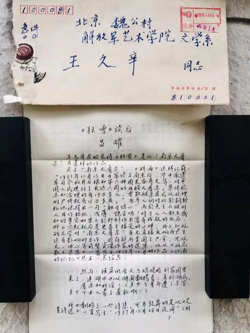昌耀的一生,寫作的詩(shī)歌評(píng)論文章寥寥無(wú)幾。據(jù)考證,昌耀的這篇詩(shī)歌評(píng)論《《狂雪》讀后》,最終并沒(méi)有發(fā)表在《青海日?qǐng)?bào)》以及其他報(bào)刊,更未收入昌耀的任何詩(shī)文選集中,從而成為了一篇鮮為人知的“集外佚文”。而據(jù)王久辛說(shuō),他已將昌耀給他的所有信件及這篇文章的原件,連同他珍藏的冰心、艾青、臧克家、孫皓暉、莫言等書法一起,捐贈(zèng)給了“侵華日軍南京大屠殺遇難同胞紀(jì)念館”珍藏。