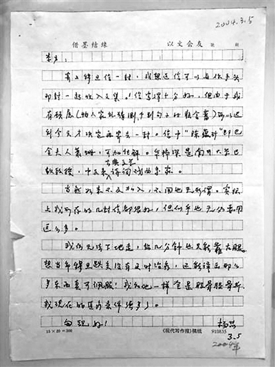 “附上我在家找到的巫寧坤(西南聯(lián)大、芝加哥大學(xué)同學(xué)、南開大學(xué)同事)舊作,供參考。查英傳常來電話,比較細(xì)心,我盡可能提供他信息。最近讓他打電話給周定一(西南聯(lián)大南荒社、高原社骨干成員),很有幫助?!睂?duì)如何編好《穆旦詩文集》,楊苡老師作為過來人與當(dāng)事者,也提出中肯的建議:“我個(gè)人以為全集前面的序不宜為僅上三個(gè)學(xué)者的文章摘抄,畢竟都是學(xué)院派的。我以為謝冕的《論中國新詩》(已獲北京三聯(lián)文藝評(píng)論一等獎(jiǎng))中必有論穆旦的,應(yīng)當(dāng)摘錄。還有詩人周良沛寫的(中國新詩穆旦卷卷首)你可能已收到趙蘅寄給你的那本小書‘穆旦詩選’。還有巫寧坤寫的一篇都可以摘取一些,使前面的代序更豐富些,也表示眾口皆碑。所謂‘代序’,也就是用了學(xué)者、詩人對(duì)穆旦的評(píng)價(jià)。對(duì)了,還有邵詩人(邵燕祥)那篇精彩的發(fā)言(已收入邵詩人最近出的集子中)也不能忘記。這樣便有七位著名學(xué)者詩人對(duì)穆旦的評(píng)價(jià)。你看對(duì)不對(duì)?這樣摘抄,我個(gè)人認(rèn)為更能使人耳目一新?!保?004年2月23日信)