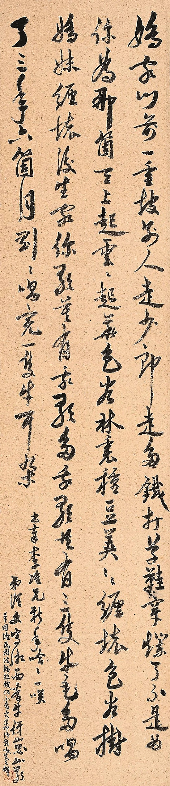 這幅《草書(shū)湘西看牛伢崽山歌》(下圖)題贈(zèng)作家李準(zhǔn),創(chuàng)作年份未注明。從落款“書(shū)奉李準(zhǔn)兄新年哈哈一笑”,可推知為賀歲之作。書(shū)法內(nèi)容別出心裁,不是常見(jiàn)的文人雅詞,而是沈從文記憶中“湘西看牛伢崽”傳唱的俚俗山歌: