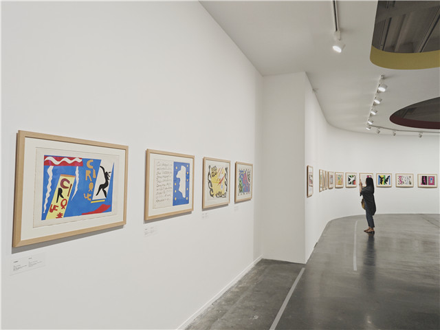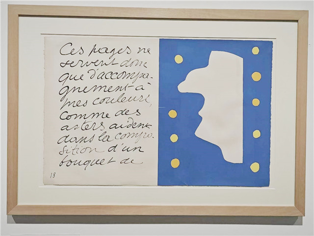 經(jīng)常有人將剪紙誤讀為 72歲的馬蒂斯因疾病纏身、無法再提筆繪畫的權(quán)宜之計。事實上,藝術(shù)家在裁剪造型、構(gòu)圖與定稿過程中體現(xiàn)了對自我和作品近乎嚴(yán)苛的要求。展陳中可見大量的剪紙作品及運用此方法創(chuàng)作的藝術(shù)書(其中最著名的是于1947年9月出版的《爵士》)、戲劇舞臺設(shè)計、壁畫、紡織物、彩色玻璃花窗等衍生作品,通過事實糾正了可能發(fā)生的誤讀。