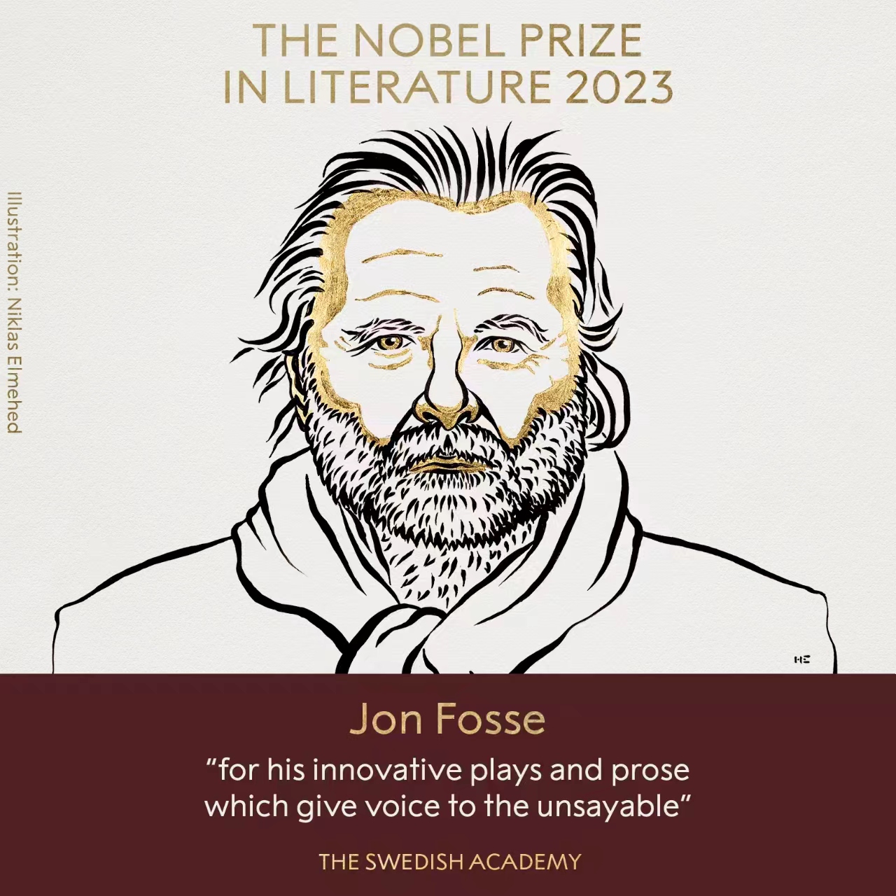瑞典斯德哥爾摩當(dāng)?shù)貢r(shí)間2023年10月5日13:00(北京時(shí)間19:00),瑞典學(xué)院將2023年度諾貝爾文學(xué)獎(jiǎng)?lì)C給了挪威劇作家約恩·福瑟(Jon Fosse),以表彰他“創(chuàng)新的戲劇和散文,為不可言說的事情發(fā)聲”。