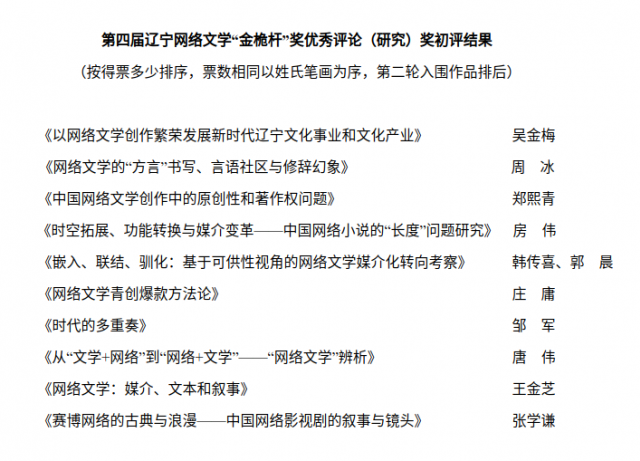第四屆遼寧網(wǎng)絡(luò)文學(xué)“金桅桿”獎(jiǎng)·優(yōu)秀評(píng)論(研究)獎(jiǎng)初評(píng)結(jié)果公示