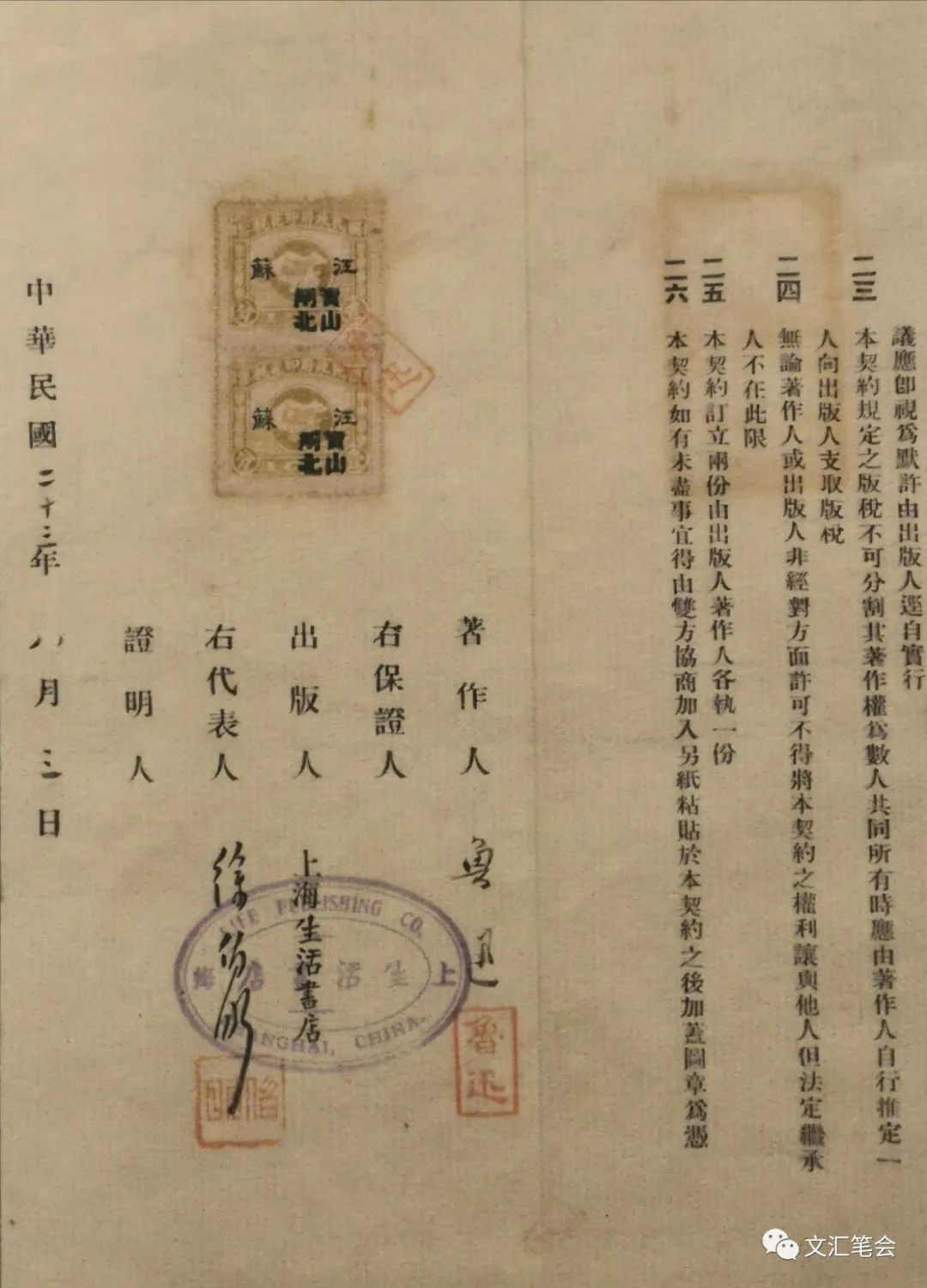 合同最后一面有著作人魯迅的親筆簽名,鈐陽文“魯迅”?。挥肘j有出版人“上海生活書店”的橢圓形藍(lán)印公章,以及生活書店代表人徐伯昕的親筆簽名,并鈐陽文“伯昕”印;在“民政局印花稅票”上又鈐陽文“魯迅”印,極為鄭重其事,合同簽署日期填寫的是“二十三年八月三日”??梢娺@是一份正式的手續(xù)完備的魯迅譯著《小約翰》的出版合同。