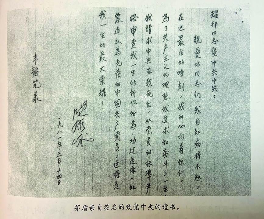 在那前一天,茅盾病重以來感覺好一點了,他躺在北京醫(yī)院119病房的病床上一直處于興奮狀態(tài),睜著眼睛在自言自語,有時伸手在被子上摸索紙筆,說是想起一段內(nèi)容要寫進回憶錄中去。韋韜叫喚他,才神志清醒過來,說“今年十月一定去廣東從化療養(yǎng),最好那時回憶錄已寫完”,還說寫完后準(zhǔn)備把《鍛煉》續(xù)寫下去。韋韜說還不如先把《霜葉紅似二月花》寫完。茅盾說,《霜》續(xù)寫曾經(jīng)試過,比較麻煩,但他想了想又表示同意。(《茅盾回憶錄》下P.410)那天夜間茅盾沒有睡好。第二天即14日,茅盾顯得特別清醒,他問兒子這兩天醫(yī)生會診的結(jié)果,疑惑怎么住院那么久(3周)還不見好,訴身體越來越?jīng)]有力氣,氣喘越發(fā)厲害,讓韋韜不用瞞,直接告訴他。韋韜比較委婉告訴他后,茅盾說:“是呀,衰老了,機器磨損了,轉(zhuǎn)不動了?!庇终f:“趁今天精神好,有兩件事可以辦一辦。”