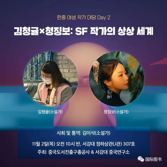 此次中韓科幻作家對話交流活動分為兩場,主題分別是 “科幻作家的創(chuàng)作世界”和 “科幻作家的幻想世界”。中國科幻作家程婧波分別同韓國科幻作家金草葉、金青橘對話,兩場活動都由韓國翻譯家和作家金依莎主持,當(dāng)?shù)刂袊膶W(xué)研究者、出版社代表及對中國語言、文化、科幻作品感興趣的讀者近80人參加。