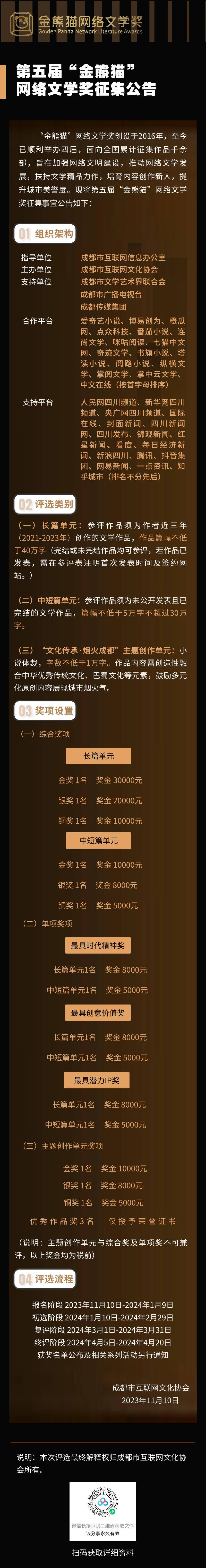 “金熊貓”網(wǎng)絡(luò)文學(xué)獎創(chuàng)設(shè)于2016年,至今已順利舉辦四屆,面向全國累計征集作品千余部,旨在加強網(wǎng)絡(luò)文明建設(shè),推動網(wǎng)絡(luò)文學(xué)發(fā)展,扶持文學(xué)精品力作,培育內(nèi)容創(chuàng)作新人,提升城市美譽度?,F(xiàn)將第五屆“金熊貓”網(wǎng)絡(luò)文學(xué)獎?wù)骷乱斯嫒缦拢?/p>