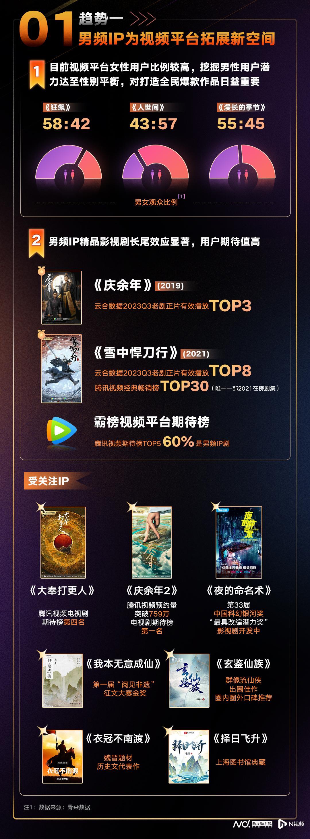 近年來,男頻IP日益受到市場關(guān)注,在影視、動漫、游戲等領(lǐng)域的影響力逐漸增強(qiáng),《IP風(fēng)向標(biāo)》指出,男頻IP在視頻平臺的空間拓展上呈現(xiàn)出新的活力。根據(jù)《2023年Q3劇集網(wǎng)播表現(xiàn)及用戶分析報告》,2023Q3愛芒騰優(yōu)上新獨播劇用戶女性用戶占比在65%-74%之間。而以現(xiàn)象級作品《狂飆》為例,骨朵數(shù)據(jù)顯示其觀眾男女性別比例為58:42;《漫長的季節(jié)》則為55:45。在這種情況下,挖掘男性用戶潛力達(dá)至性別平衡對打造全民爆款作品日益重要。