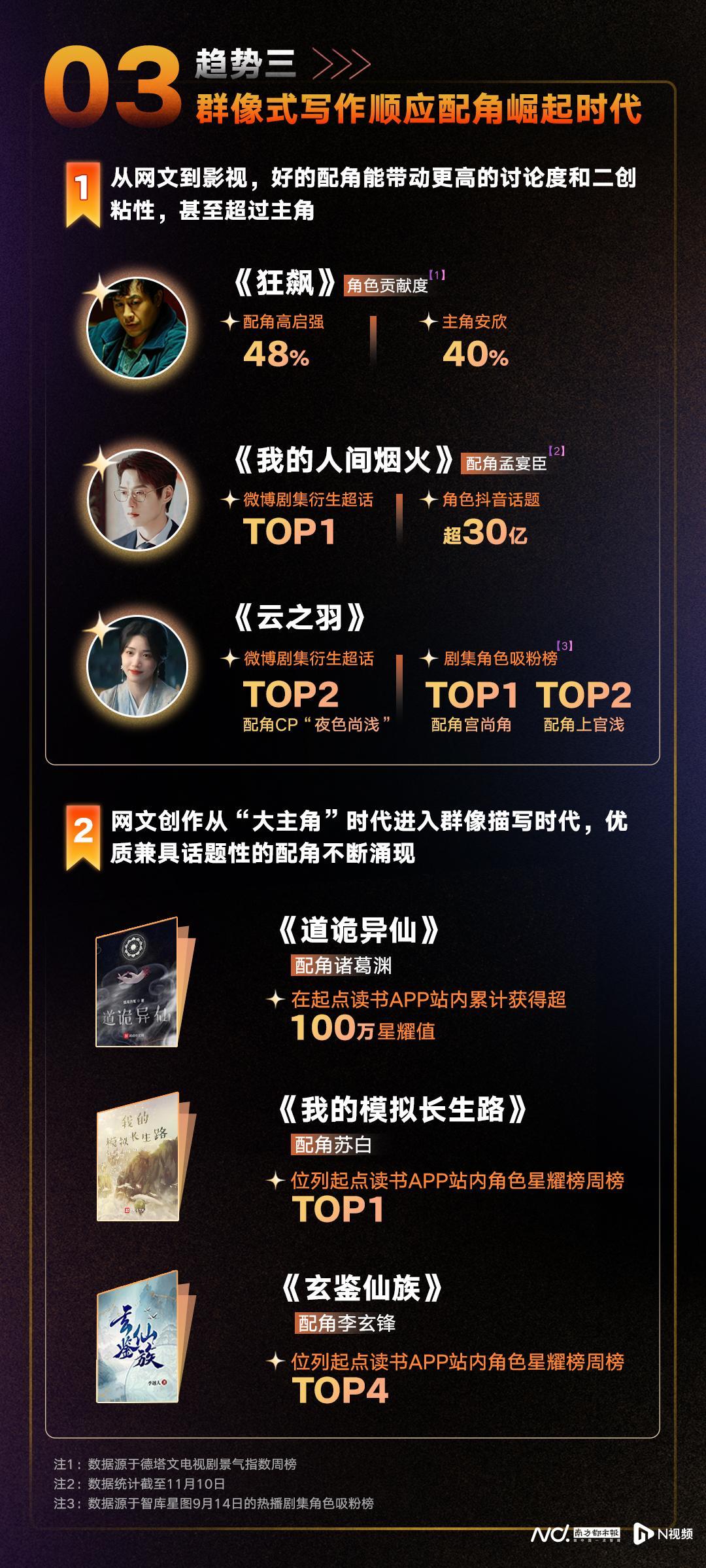 角色塑造趨勢方面,《IP風(fēng)向標(biāo)》指出,配角崛起時代,群像式寫作已經(jīng)成為一大重要趨勢。德塔文電視劇景氣指數(shù)周榜顯示,在電視劇《狂飆》的角色貢獻(xiàn)度中,配角高啟強(qiáng)占48%,超過主角安欣8%,從網(wǎng)文到影視,好的配角能帶動更高的討論度和二創(chuàng)黏性,甚至超過主角。