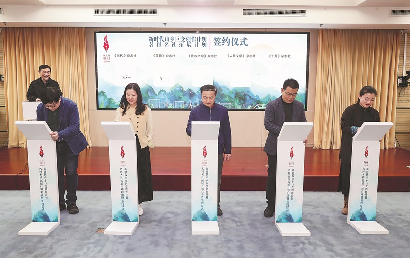 中國作協(xié)實(shí)施“新時(shí)代山鄉(xiāng)巨變創(chuàng)作計(jì)劃”以來,引領(lǐng)廣大作家以強(qiáng)烈的歷史主動(dòng)精神深入生活、扎根人民,熱忱描繪新時(shí)代新征程的恢宏氣象,書寫生生不息的人民史詩。2023年,中國作協(xié)兩次召開工作推進(jìn)會(huì),組織作品改稿班,建立“新時(shí)代山鄉(xiāng)巨變創(chuàng)作計(jì)劃”年會(huì)制度,拓展優(yōu)秀選題創(chuàng)作出版渠道,增強(qiáng)社會(huì)傳播力和影響力。圖為2月23日在北京舉行的“新時(shí)代山鄉(xiāng)巨變創(chuàng)作計(jì)劃”名刊名社拓展計(jì)劃啟動(dòng)暨簽約儀式現(xiàn)場。