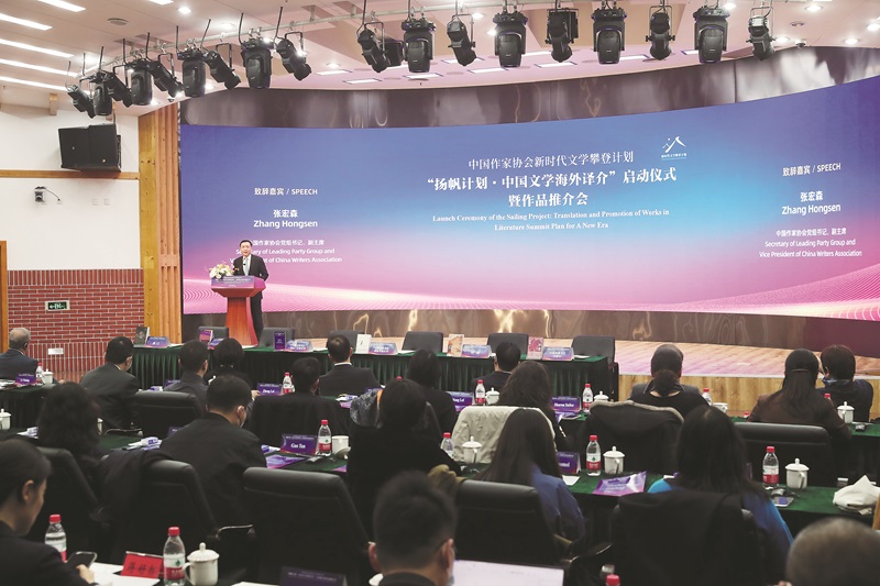 中國作協(xié)實(shí)施“新時(shí)代文學(xué)攀登計(jì)劃”以來,凝聚優(yōu)秀的作家、出版社、文學(xué)期刊等優(yōu)質(zhì)文學(xué)資源,對(duì)文學(xué)創(chuàng)作、編輯、出版、傳播、轉(zhuǎn)化全流程統(tǒng)籌協(xié)調(diào),積極搭建平臺(tái),形成聯(lián)動(dòng)機(jī)制,共同打造中國當(dāng)代文學(xué)精品,推動(dòng)新時(shí)代文學(xué)高質(zhì)量發(fā)展。為搭建起中國文學(xué)與世界各國讀者的溝通橋梁,讓更多的外國讀者更好地認(rèn)識(shí)中國、了解中國、理解中國,2月23日,中國作協(xié)在京啟動(dòng)了該計(jì)劃的子計(jì)劃“揚(yáng)帆計(jì)劃·中國文學(xué)海外譯介”,并舉辦作品推介會(huì)。圖為“揚(yáng)帆計(jì)劃·中國文學(xué)海外譯介”啟動(dòng)儀式現(xiàn)場。