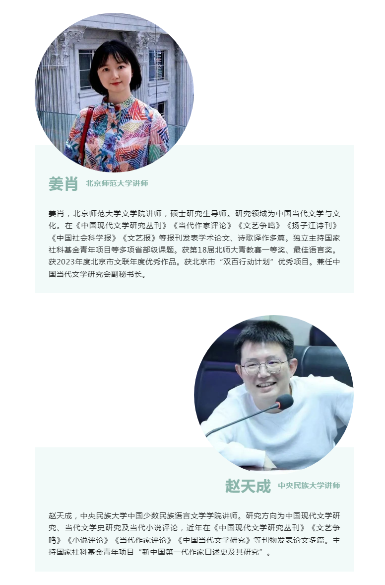趙天成:現(xiàn)在供職于中央民族大學(xué)中國少數(shù)民族語言文學(xué)學(xué)院。主要研究方向是現(xiàn)代和當(dāng)代文學(xué)史,也做一些當(dāng)代文學(xué)批評。因為工作的關(guān)系,近年也會關(guān)注中國少數(shù)民族的文學(xué)和文化。