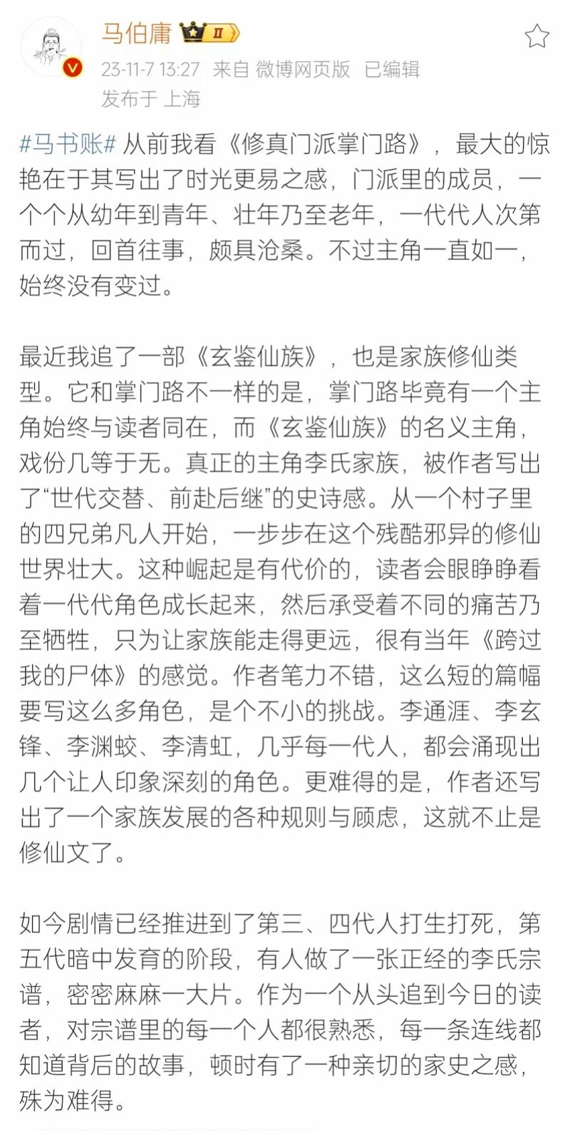 著名作家馬伯庸也是《玄鑒仙族》的讀者,對《玄鑒仙族》的群像寫法拍案驚贊。他認為,書中的李氏家族被作者寫出了“世代交替、前赴后繼”的史詩感?!皬囊粋€村子里的四兄弟凡人開始,一步步在這個殘酷邪異的修仙世界壯大。這種崛起是有代價的,讀者會眼睜睜看著一代代角色成長起來,然后承受著不同的痛苦乃至犧牲,只為讓家族走得更遠。”