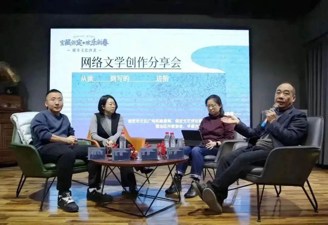 1月20日,河北保定市舉辦“網(wǎng)絡(luò)文學(xué)創(chuàng)作分享會”,邀請第五屆茅盾文學(xué)新人獎·網(wǎng)絡(luò)文學(xué)獎提名獎獲得者、河北省網(wǎng)絡(luò)作協(xié)副主席純銀耳墜做了《網(wǎng)絡(luò)文學(xué):從讀到寫的進(jìn)階》專題分享,并與河北大學(xué)藝術(shù)學(xué)院副教授、保定市文藝評論家協(xié)會副主席郎靜,青年文學(xué)評論家、保定市政府研究室副主任吳媛等嘉賓進(jìn)行了對談交流。60多位本地作家和文學(xué)愛好者參加了活動。網(wǎng)絡(luò)文學(xué)評論家桫欏主持了分享會。