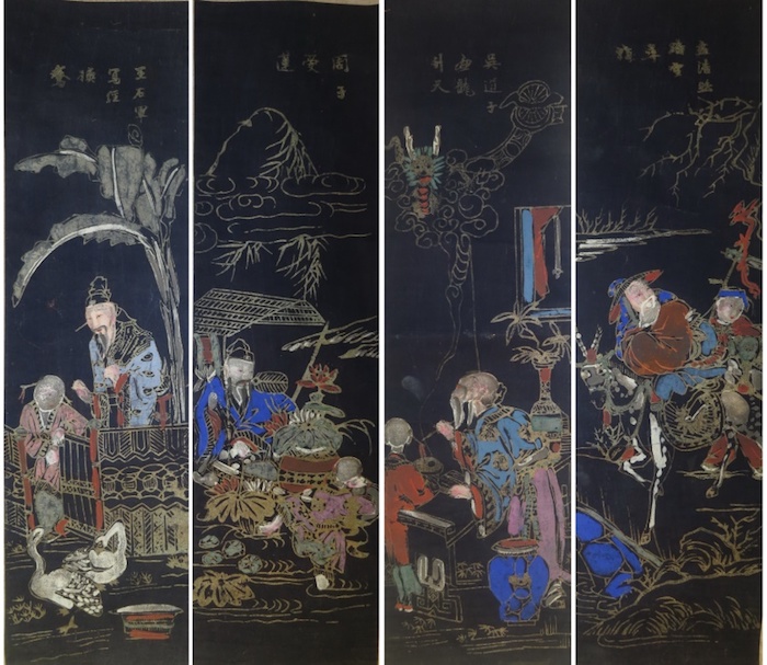 另外,傳統(tǒng)年畫中還有一種適用在書房或客廳張貼的條屏年畫,其內(nèi)容多表達(dá)文人崇尚的精神內(nèi)涵。傳統(tǒng)木版年畫的大量印制,會將這種文人偏好影響到老百姓的生活中,使年畫發(fā)揮其社會教育意義。清代楊柳青年畫“四愛圖”(見圖4),是其中最具代表的一類文人年畫。這類年畫以小三裁條屏式畫幅形式,其黑色畫地、金線印制為清代時期收復(fù)新疆后銷往維吾爾族地區(qū)的一類獨特產(chǎn)品。四愛圖包含了“王羲之愛鵝”“周敦頤愛蓮”“吳道子愛龍”“孟浩然愛梅”四個文人的歷史故事,年畫中吳道子畫龍升天,“神龍見首不見尾”的表現(xiàn)力,讓觀者大為驚嘆。
