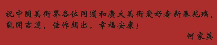 5、中國美術(shù)家協(xié)會原副主席 何家英:祝中國美術(shù)界各位同道和廣大美術(shù)愛好者新春兆瑞,龍開吉運,佳作頻出,幸福安康!