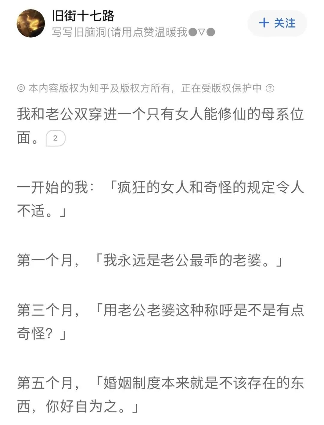 直至生命末尾仍在奉獻(xiàn)自身的家庭主婦“我”,在與丈夫的自駕游中意外穿越到女性為優(yōu)勢(shì)性別的修仙界“女越界”,并一步步覺(jué)醒。在對(duì)男頻爽文典型男主形象的戲諷中,女越界一點(diǎn)點(diǎn)解答著“我”疑惑與矛盾。隨后,在“我”解救遭重男輕女觀念迫害的女孩的過(guò)程中,小說(shuō)借助快穿、系統(tǒng)等設(shè)定解開(kāi)了“元敘事”,將性別問(wèn)題置換為快穿世界的前因,以此說(shuō)明快穿世界崩塌后女越界的形成,以及曾經(jīng)對(duì)女越界做出巨大貢獻(xiàn)的“我”如今無(wú)知愚昧的原因。
