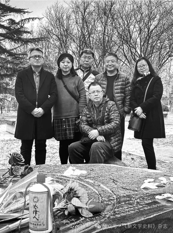 與海子同時(shí)代的校友、詩(shī)友們?cè)诜ù蟛叫@海子石碑前祭奠,左二為本文作者,2021年3月26日