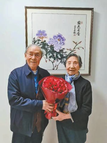 2024年新年,束沛德與夫人手捧文友贈(zèng)送的鮮花,合影留念。