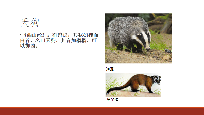 日本的很多怪獸都源于《山海經(jīng)》,日本動漫里還有一種怪獸叫天狗,天狗特別可怕,古代日本天皇每年都要舉行儀式祭祀天狗,天狗也是源于《山海經(jīng)》?!段魃浇?jīng)》說:“有獸焉,其狀如貍而白首,名曰天狗,其音如榴榴,可以御兇?!边@種動物名叫天狗,可能長得跟狗很像,它的腦袋是白色的,很可能是狗獾,狗獾臉上長著白色的毛,四川人就稱狗獾為天狗。但書中說天狗“其狀如貍而白首”,也可能是果子貍,果子貍的臉上也長著白毛,而且長得很像貍貓。不管它像狗獾還是果子貍,天狗肯定是一種現(xiàn)實中的動物。