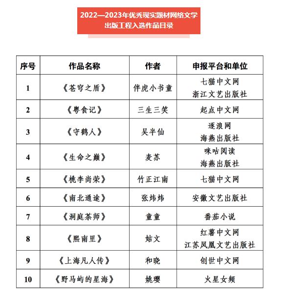 2022-2023年優(yōu)秀現(xiàn)實(shí)題材網(wǎng)絡(luò)文學(xué)出版工程入選作品揭曉