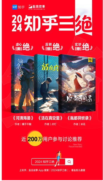 4月18日,經(jīng)過近200萬用戶參與討論推薦,以口碑、圈層影響力和IP開發(fā)潛質(zhì)為評(píng)選標(biāo)準(zhǔn),《胤都異妖錄》《河清海晏》《活在真空里》三部短篇故事入選“新知乎三絕”名單?!靶轮跞^”的誕生,也標(biāo)志著知乎鹽言故事進(jìn)入作品規(guī)模化、品類多元化、作品IP化的全新發(fā)展階段。
