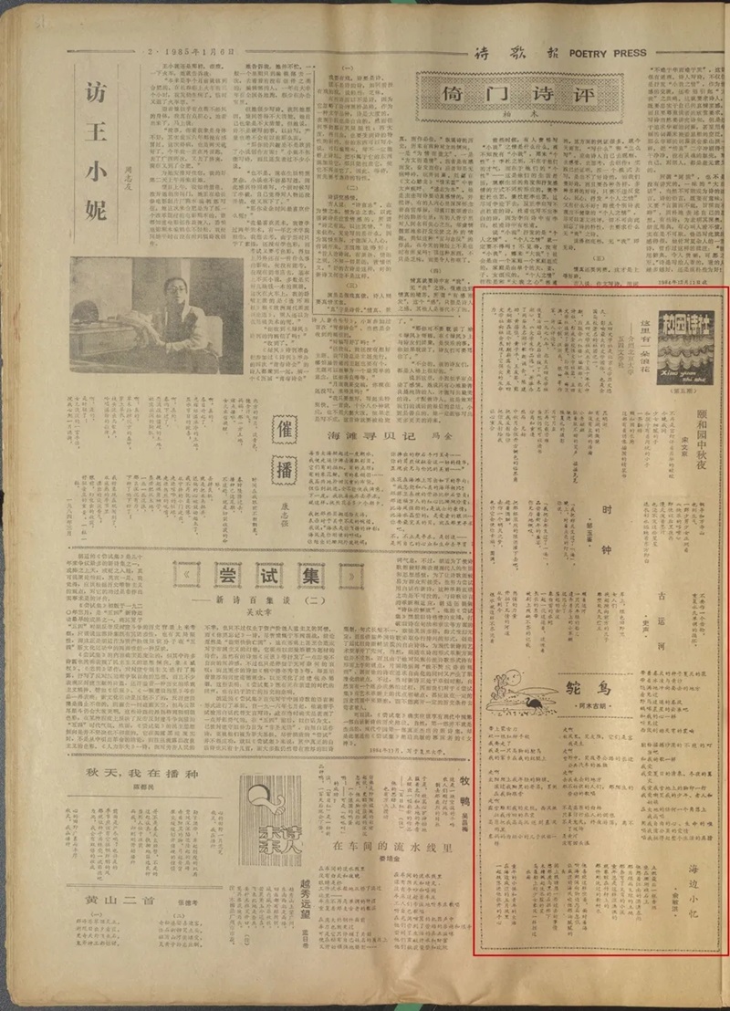 編者按:《詩歌月刊》編輯整理創(chuàng)刊40周年資料時(shí),在1985年1月6日的《詩歌報(bào)》(刊物前身)上,看到署名“俞敏洪”的一首詩作《海邊小憶》,不禁疑惑地問:這位是否就是新東方的俞老師呢?仔細(xì)一研讀,發(fā)現(xiàn)這一期“校園詩社”欄目介紹的正是北京大學(xué)五四文學(xué)社。時(shí)間也能對得上。確定是俞敏洪沒錯了!