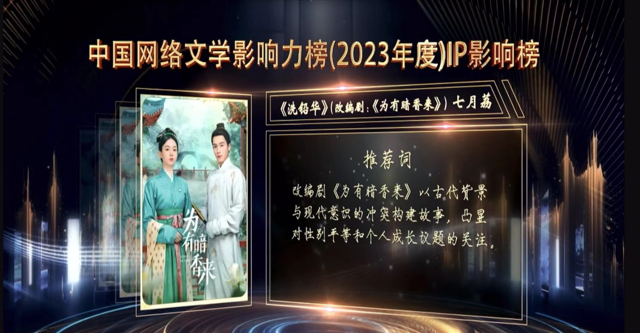 IP影響榜上榜推薦詞認為,《洗鉛華》改編劇《為有暗香來》以古代背景與現(xiàn)代意識的沖突構(gòu)建故事,凸顯對性別平等和個人成長議題的關(guān)注。七月荔表示,故事創(chuàng)作讓自己不僅獲得物質(zhì)收入,也收獲了無數(shù)精神財富,她感到鼓舞和激勵,將繼續(xù)為讀者創(chuàng)作好作品。