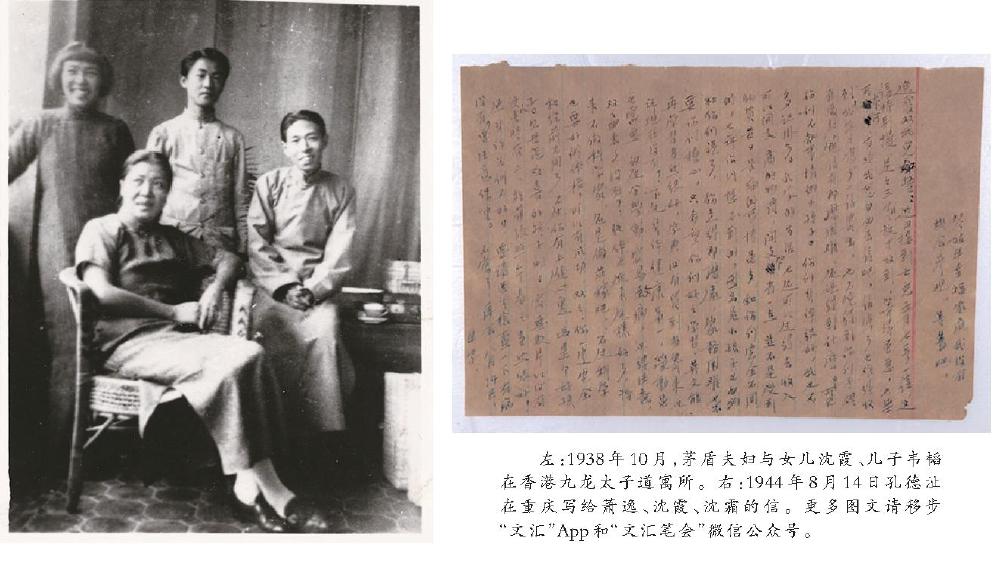 左:1938年10月,茅盾夫婦與女兒沈霞、兒子韋韜在香港九龍?zhí)拥涝⑺?。右?944年8月14日孔德沚在重慶寫給蕭逸、沈霞、沈霜的信。