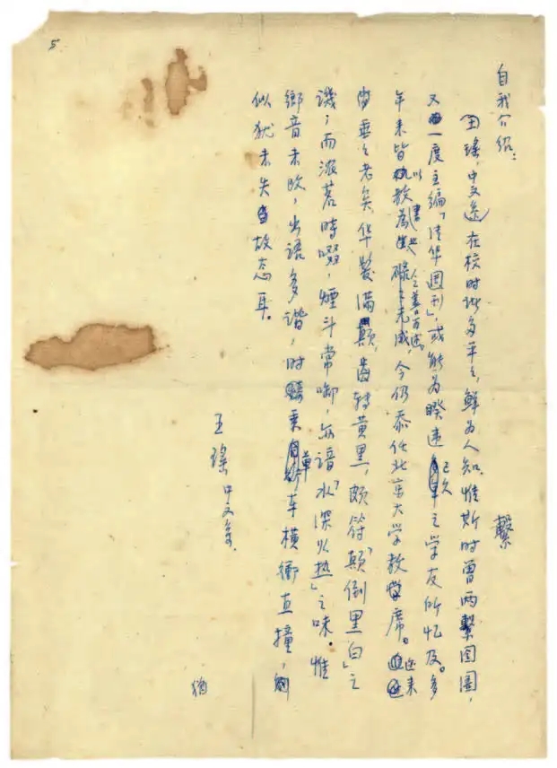 王瑤《自我介紹》手稿