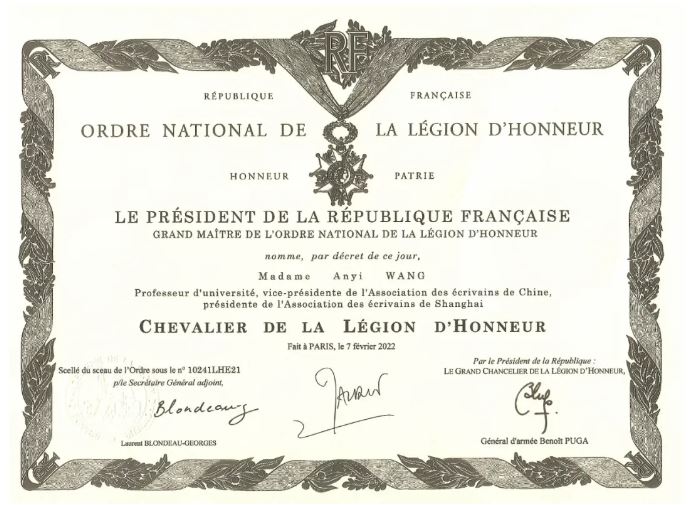 中國作家王安憶獲法蘭西共和國榮譽軍團騎士勛章