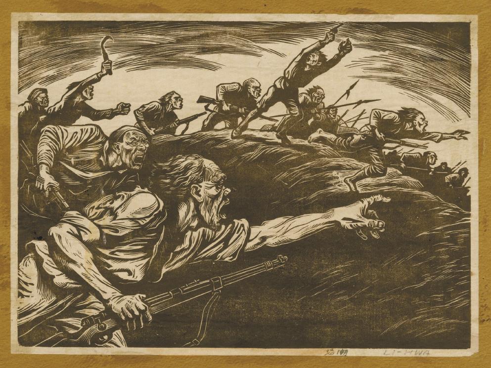 李樺《怒潮》組畫之《起來》黑白木刻(1946年)