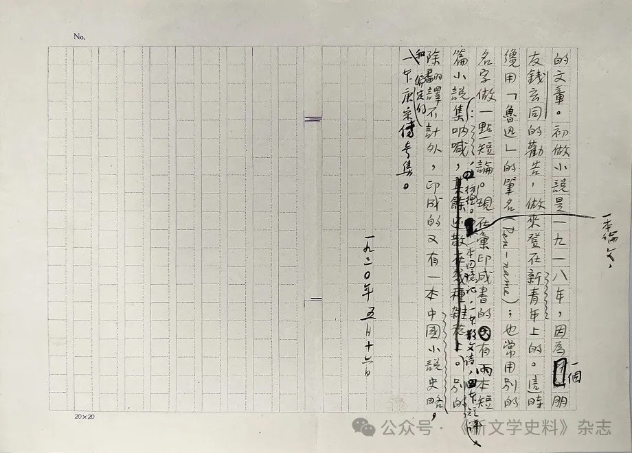 不同于用于再編的、經(jīng)過(guò)修改謄寫的《南腔北調(diào)集·〈自選集〉自序》手稿,“魯迅手稿補(bǔ)遺一頁(yè)”是用于初次刊印的,寫作時(shí)間應(yīng)即《南腔北調(diào)集·〈自選集〉自序》文末所記“一九三二年十二月十四日”。筆者翻查了此日前、后數(shù)年的魯迅文稿,檢出由柔石錄寫、魯迅題名并作改的《魯迅自傳》手稿⑥,所用稿紙和“魯迅手稿補(bǔ)遺一頁(yè)”相似度較高,頁(yè)面布局、紋路細(xì)節(jié)基本一致。此種《魯迅自傳》稿共三頁(yè),一列二十格,共二十列,格線淡紫色;稿紙高19.4cm,寬27cm,頁(yè)眉左端印“NO.”,頁(yè)腳左端印“20×20”。此稿第三頁(yè)只占用了右半頁(yè),左半為空白稿紙,為便于比較觀覽,錄末頁(yè)圖版于此,見上圖。