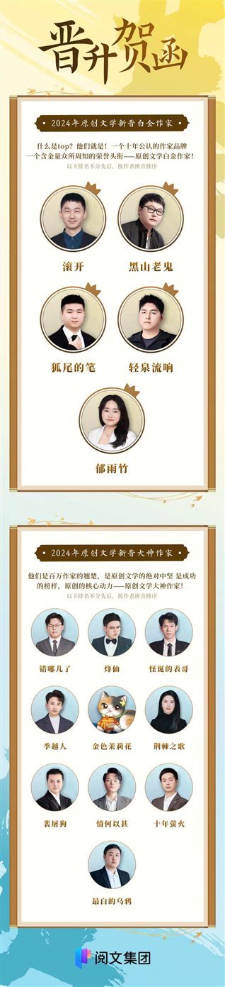 歷經(jīng)十余年的沉淀,“白金大神”作家晉級榜公布,已成為網(wǎng)絡(luò)文學(xué)界的標(biāo)志性事件。作為業(yè)內(nèi)最具含金量的頂尖網(wǎng)絡(luò)作家榮譽(yù),它不僅代表著對作家優(yōu)異成績的認(rèn)證和嘉獎,更是網(wǎng)文作者們職業(yè)生涯“里程碑”的關(guān)鍵性象征。新的年度、新的榜單,也是作家隊(duì)伍新的力量和血液,更多才華與潛力兼具的作家,正從屏幕后走到舞臺前。