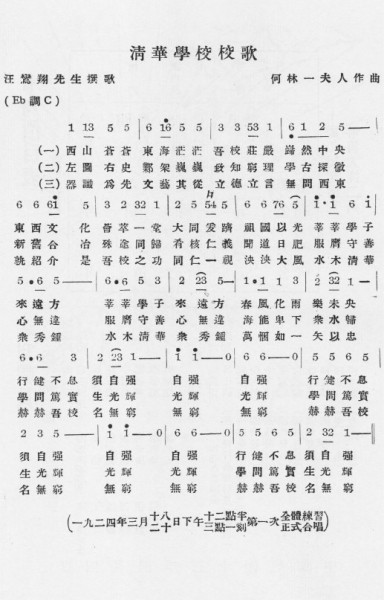 另見徐葆耕著《老校歌與清華傳統(tǒng)》一文(收入其《紫色清華》一書,民族出版社,2001),作者提到“汪鸞翔先生作詞、張惠珍女士譜曲的《清華校歌》,傳唱一時,堪稱佳作”。