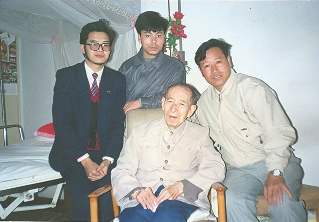1992年5月19日,湯繼強(qiáng)(左一)陪同《演講與口才》雜志社副社長殷銘(右一)去省人民醫(yī)院看望艾蕪(中坐)