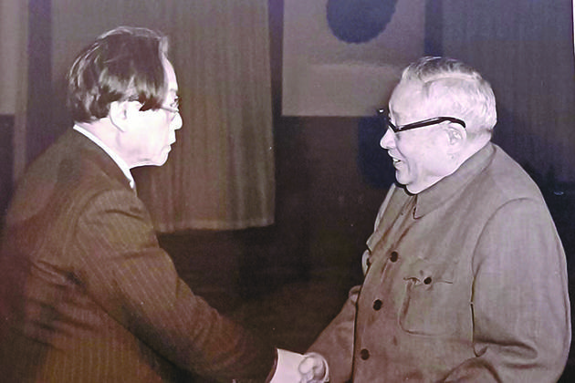 1982年12月,廖承志(右)在北京人民大會堂會見野間宏。