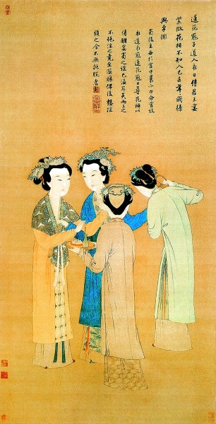晚明至清,陸續(xù)有來自西方的傳教士如利瑪竇、郎世寧等人帶來全新的繪畫樣式,為仕女圖的創(chuàng)作注入了新鮮血液。尤其是康乾時(shí)期,以焦秉貞、陳枚等人為代表的宮廷畫家,在中國傳統(tǒng)繪畫樣式中引入西方的明暗、透視等繪畫理念,將西畫追求寫實(shí)的造型方法和空間意識運(yùn)用到中國畫的創(chuàng)作中,開仕女題材繪畫新風(fēng)。這一時(shí)期涌現(xiàn)出的許多仕女題材作品筆法工整,設(shè)色濃艷,人物大多臉龐長圓,柳眉細(xì)目,面部塑造多以赭石等色彩暈染出明暗關(guān)系,使結(jié)構(gòu)更加豐滿、立體。