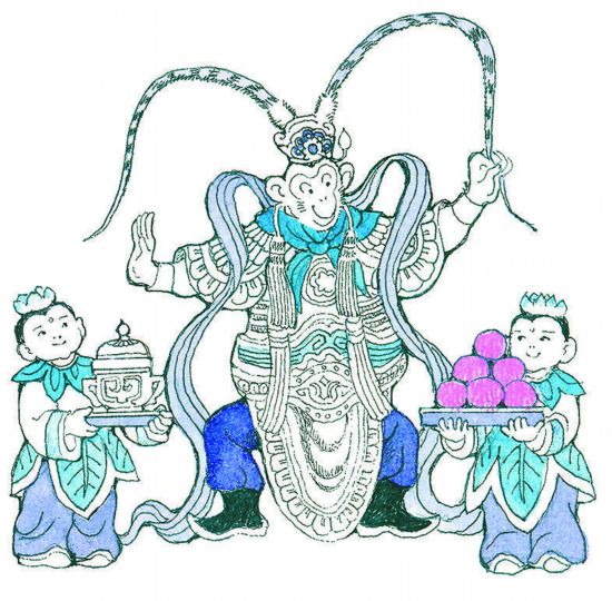 其次,此書堅守了原著的人文精神。原著最具文化普適性的主題是不畏艱難的取經(jīng)精神。兒童的身體和精神皆需成長,成長就是不斷克服困難的學習歷程?!皩W以成人”既是儒家的修身目標,也是取得真經(jīng)的隱喻。最初猴王在花果山上整天吃喝玩樂反生厭倦,故而魯兵把猴王離開花果山的起因界定為外出拜師學藝。離家是兒童成長的經(jīng)典姿態(tài),也是英雄成長的起點。猴王陷入困境、離家歷險、愿望滿足、重返家鄉(xiāng)的敘事模式便是兒童將要經(jīng)歷的人生之路的象征,而且也是中華民族自強不息精神的完美體現(xiàn)。