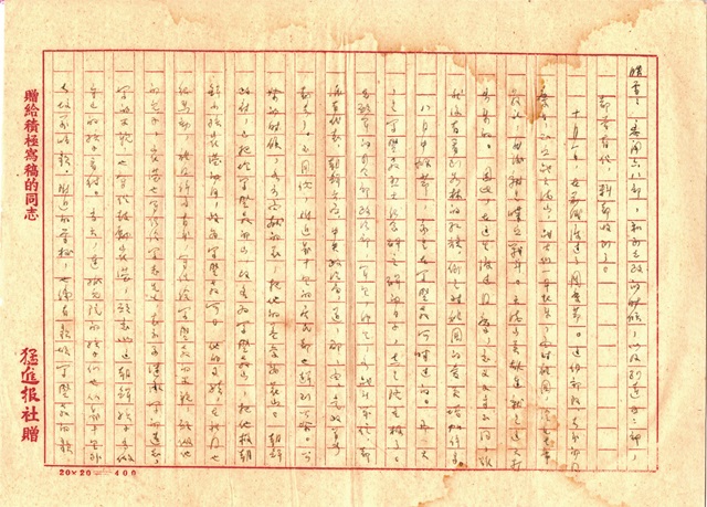 最后一封寫于10月6日的信可被視為這段激流生活的片尾預(yù)告。由于當(dāng)晚收到47軍軍報(bào)《猛進(jìn)報(bào)》的約稿,所以便用猛進(jìn)報(bào)社所贈(zèng)的印有“贈(zèng)給積極寫稿的同志”的5頁(yè)紙來寫信。李蕤向妻子報(bào)告了一件喜事,那就是他在朝鮮與七年未見的妻弟白玉重逢,二人促膝長(zhǎng)談過去和新生活,最為慨嘆的便是當(dāng)年被國(guó)民黨抓兵之后的悲慘,與逃脫之后在共產(chǎn)黨這里獲得的解放形成了鮮明對(duì)比。同時(shí),他還囑咐妻子可無需再往朝鮮給自己寫信,因?yàn)榛氐阶鎳?guó)的日子近了。
