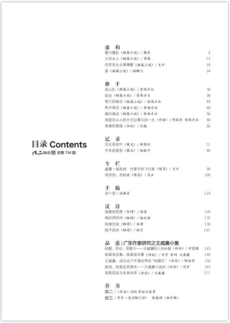 一次和小瓊談到這個(gè)話題,我說何不將評(píng)判權(quán)交給年輕人,“90后寫,90后編”。小瓊以為然。她執(zhí)行力超級(jí)強(qiáng),將欄目改成“90后推90后”,建起500人的微信群,設(shè)計(jì)了接龍的形式,一期刊發(fā)一男一女兩位“90后”的小說,下一期由上一期的作者任初選編輯,負(fù)責(zé)從投稿中選出3篇作品,再由500人群的年輕人投票決選出下一期的上稿者,依此類推,選定稿件后,我們才介入后續(xù)的編輯工作。后又邀請(qǐng)尚在中大讀博的徐威開設(shè)“90后文學(xué)觀察”的評(píng)論欄目,形成了“90后寫、90后編、90后評(píng)”的生態(tài)。這一舉措引起了文壇的關(guān)注,《文藝報(bào)》聯(lián)合《作品》合辦了“新天90后”欄目,從此,“90后”作家成為各大文學(xué)期刊爭相約稿的對(duì)象,今天活躍的“90后”寫作者,很大一部分就是從《作品》和“新天90后”起步的,《作品》雜志也因此獲得了年輕人的信任,我們也嘗到了力推年輕人的甜頭。