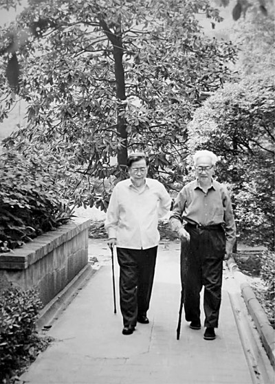 1980年,巴金(右)與曹禺在巴金寓所散步