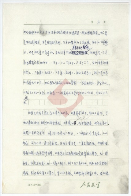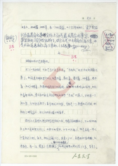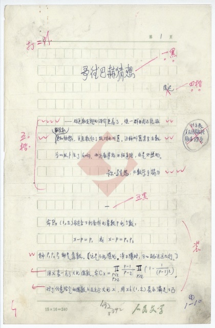 該稿共43頁(yè),作者用藍(lán)黑墨水在“人民文學(xué)15X16=240”的稿紙上進(jìn)行創(chuàng)作。每張手稿右上角均有頁(yè)碼標(biāo)識(shí),其中包括第1-37頁(yè),第39-44頁(yè)。不知什么原因,該稿并沒(méi)有第38頁(yè)。經(jīng)筆者細(xì)讀,并與《人民文學(xué)》上發(fā)表的《哥德巴赫猜想》對(duì)照,發(fā)現(xiàn)該稿第37頁(yè)與第39頁(yè)的內(nèi)容前后連貫,很有可能是作者將第38頁(yè)錯(cuò)標(biāo)為第39頁(yè)。