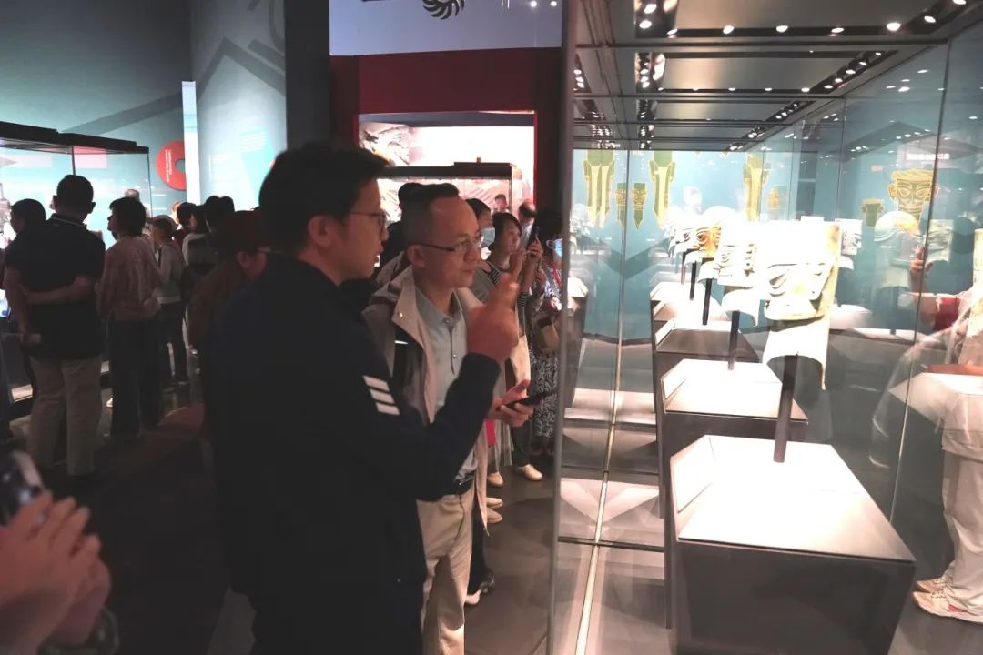 展廳入口處,一面花紋精致、紋樣復(fù)雜的古鏡狀電子顯示屏放映著三星堆與金沙文物的介紹片,青銅大力人、戴冠縱目青銅面具、黃金面具……這些造型奇特的文物不禁讓作家們對接下來的參觀充滿期待。展廳內(nèi)人頭攢動,每一件文物藏品前都圍滿了熱切求知的觀眾,作家們也加入其中,不時在文物前駐足細細觀賞,并拿起手機拍照記錄展品的精美。通過參觀,作家們逐步了解了三星堆與金沙文明的歷史背景和考古過程,收獲頗豐,感慨良多。