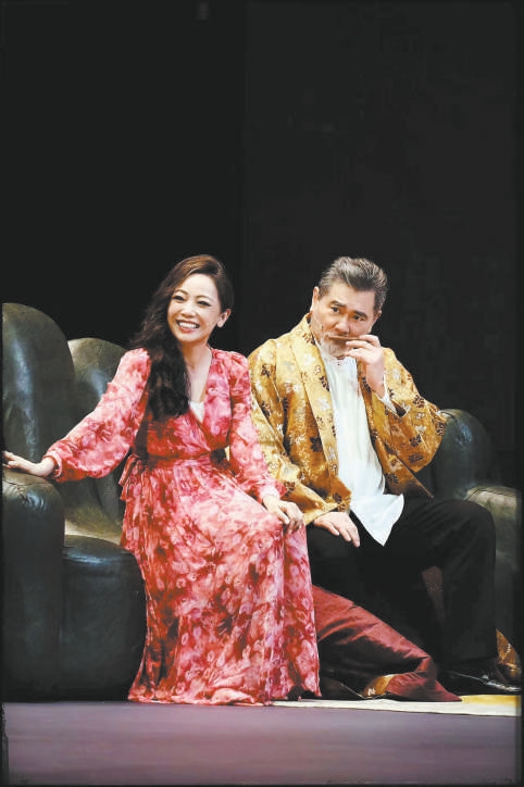 打磨人物,不僅要貼近人物的內(nèi)心,還要轉(zhuǎn)化生成一套獨特的表演語法,才能引發(fā)觀眾的震顫。《鱷魚》中的人物設(shè)計相當(dāng)現(xiàn)代。角色固然有其姓名,但在稱呼上卻體現(xiàn)為復(fù)雜身份的交替,例如單無憚:一會兒是落馬失勢、人人喊打的“市長”,一會兒是家中掌權(quán)、威風(fēng)凜凜的“老爺”,一會兒又是唯利是圖、眾叛親離的“舅舅”,如此微妙的心態(tài)變化,皆要演員下足功夫,琢磨人物的一舉一動。趙文瑄與鄧萃雯兩位演員,在人物口音塑造上花了不少心思。趙文瑄談吐論說時,既要保留那種拿腔作勢,又要有自詡為詩人的韻律感,所以必須格外注重每一句話的重音位置,才能使臺詞成為動作性的表達。鄧萃雯的“港普”暗示了人物復(fù)雜的身份經(jīng)歷,為了表現(xiàn)出瘦馬這一“情婦”角色獨有的悲涼感,她在形體表現(xiàn)上的婀娜多姿、風(fēng)情萬種,也與語言上的牙尖嘴利、咄咄逼人形成反差,展現(xiàn)出了人物可氣與可悲的矛盾處境。