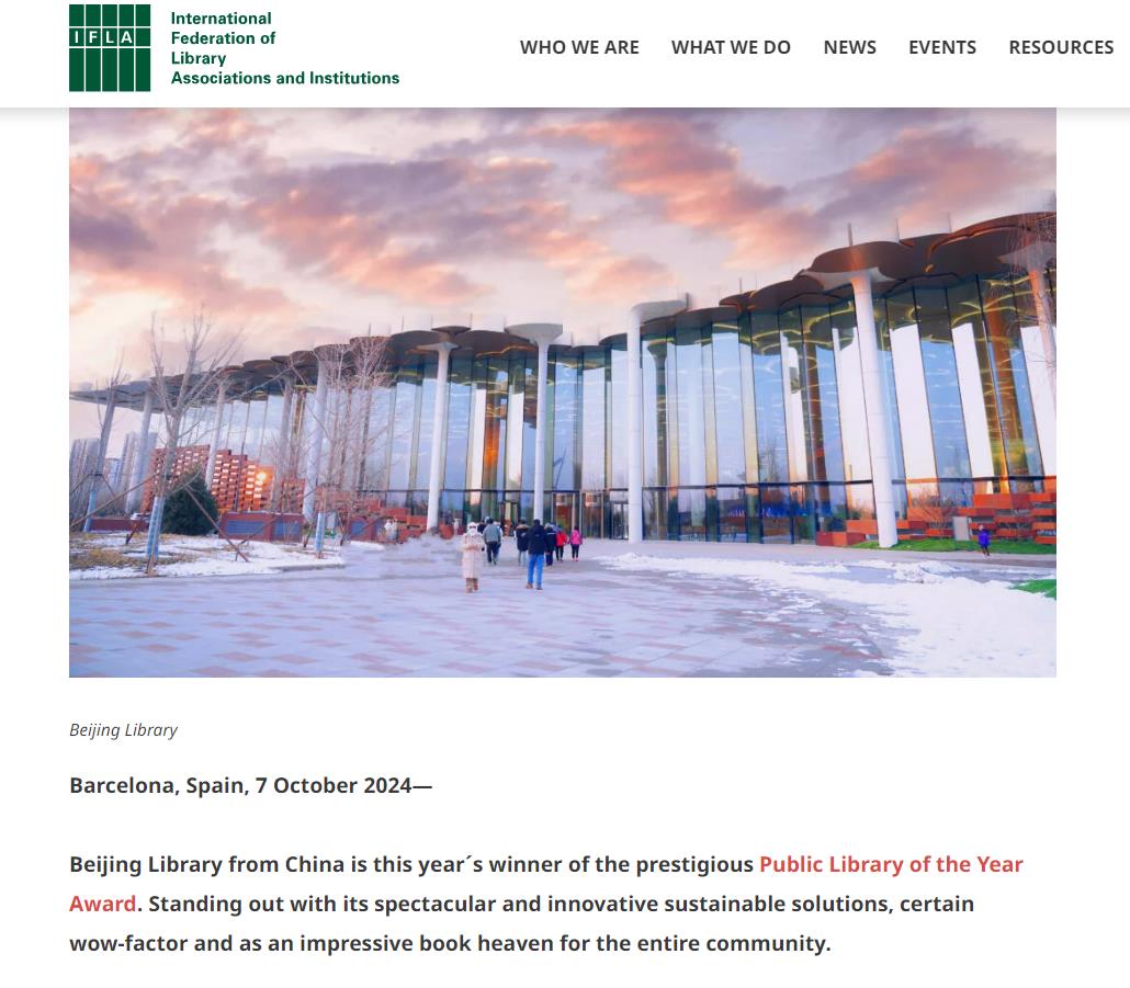 北京城市圖書館榮獲國際圖聯(lián)(IFLA)2024年度公共圖書館獎